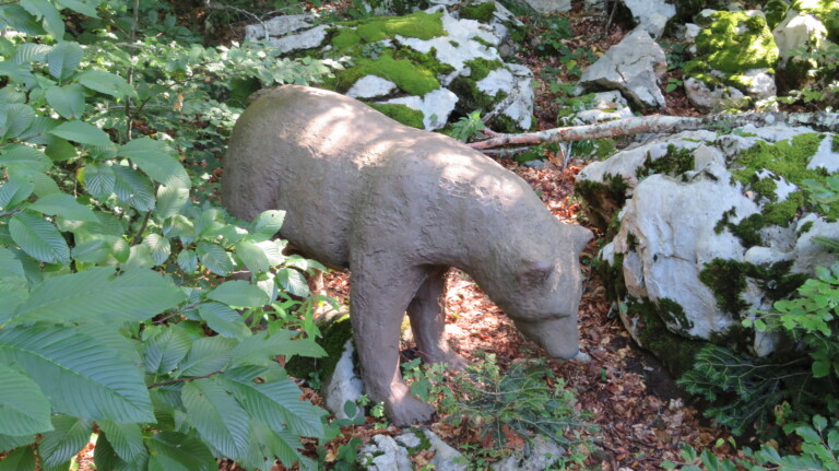 Kamena statua medvjeda u šumi.